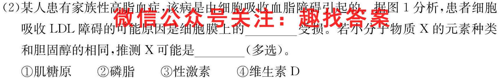 (2)某人患有家族性高脂血症,该病是由细胞吸收血脂障碍引起的。据图1分析,患者细胞吸收LDL障碍的可能原因是细胞膜上的受损。若小分子物质X的元素种类和胆固醇的相同,推测X可能是(多选)。①肌糖原②磷脂③性激素④维生素D
