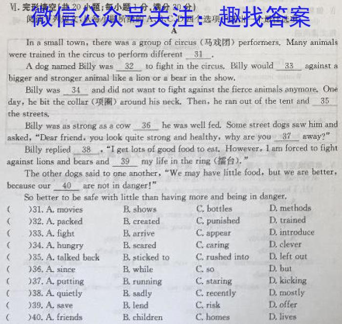 Ⅵ.完形填空(共20小题;每小题1分,满分20分)阅读下列短文,从每小题所给的A、B、C、D四个选项中选出一个最佳选项。AIn a small town, there was a group of circus (马戏团) performers, Many animalswere trained in the circus to perform different 31.A dog named Billy was 32 to fight in the circus. Billy would 33 against abigger and stronger animal like a lion or a bear in the show.Billy was 34 and did not want to fight against the fierce animals anymore. Oneday, he bit the collar(项圈) around his neck. Then, he r an out of the tent and 35the streets.Billy was as strong asa cow 36 he was well fed Some street dogs sew him andasked, “Dear friend, you look quite strong and healthy, why are you 87 eway?"Billy replied 38, "I get lots of good food to eat. However, 1 am forced to fightagainst lions and bears and 39 my life in the ring ( 台) .”The other dogs said to one an at her, “We may have little food, but we are better,becuse our 40 are not in ____ danger”So h etter to be safe with little than having more and being in danger.( ) 31. A. movies B.shows C. bottles D. methods( ) 32.A. packed B.created C.punished D. trained( ) 33.A. fight B.arrive C. appear D. introduce( ) 34.A. hungry B.scared C.caring D.clever( ) 35.A. talked backB. sticked to C. rushed intoD. left out( ) 36.A. since B. while C. so D.but( ) 37.A.putting B. running C. staring D. kicking( ) 38. A. quietly B. sadly C.recently D. mostly( ) 39. A. save B.lend C. risk D.offer( )40..A. friends B.children C. homes D. livesM.补全对话(共5小题;每小题1分,满分5分)根据对活内容,从方框内的选项中选出能填人空白处的最佳选项,其中有两个为多余选项。$$A _ { 1 }$$What terrible weather it is today. Id love to go out, but I think it will keep raining.____B:Oh, I d on’t know. 5.A:I hope you’re right. I’m going to have party this Saturday. 52.____B:Sure, I'd love to. Thank you for inviting me. 53. ____A:Well, a number of people haven’t told me yet.54.____B:I can help, too!A: That would be great! 55.____B:I'll make fruit salad.A:That sounds delicious!