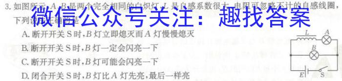 10.如图所示,质量为m、电阻为R、边长为L的正方形金属线框的cd边恰好与有界匀强磁场的上边界重合,现将线框在竖直平面内由静止释放,当下落高度为h(h 11.关于“亚洲一号”地球同步通讯卫星,下述说法正确的是()A.已知它的质量是1.2t,若将它的质量增为2倍,其同步轨道半径变为原来的2倍B.它的运行速度小于地球的第一宇宙速度,卫星内部物体处于完全失重状态C.它可以绕过北京的正上方,所以我国能利用其进行电视转播D.它的周期是24h,其轨道平面与赤道平面重合且距地面高度一定 3.如图所示,A、B是两个完全相同的白炽灯,L是自感系数很大、电阻可忽略不计的自感线圈,下列说法正确的是A.断开开关S时,B灯立即熄灭而A灯慢慢熄灭B.断开开关S时,B灯一定会闪亮一下C.断开开关S时,B灯可能会闪亮一下D.闭合开关S时,B灯比A灯先亮,最后一样亮2023届玉树州高三第三次联考(233446Z)z物理第一部分