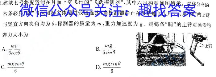 1.嫦娥七号将配置能在月面上空飞行的“飞跃探测器”,其中六足构型如图所示。对称分布的六务轻质“腿”与探测器主体通过铰链连接,当探测器静止在水平地面上时,六条“腿”的上臂与竖直方向夹角均为θ,探测器的质量为m,重力加速度为g。则每条“腿”的上臂对测器的弹力大小为A.mg6gC.mg6