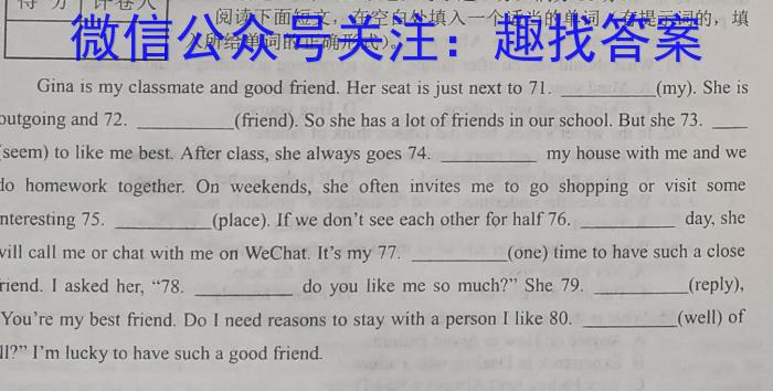 X.词语运用(共10小题;每小题1分,满分10分)阅读下面短文,在空白处填入一个适当的单词(有提示词的,填入所给单词的正确形式)。Gina is my classmate and good friend. Her seat is just next to 71. ____(nny) . She isoutgoing and 72. (friend) . So she has a lot of friends in our school. But she 73. ________(seem) to like me best.After class, she always goes 74. my house with me and we____do homework together. On weekends, she often invites me to go shopping or visit someinteresting 75. (place) . If we d on't see each other for half 76. day, she________will call me or chat with me on We Chat. It’s my 77. ____(one) time to have such a closefriend. I asked her. “78. do you like me so much?”She 79. (reply) ,________“You're my best friend. Do I need reasons to stay with a person I like 80. (well) of____all?Im lucky to have such a good friend将所给词语连成句子,要求符合语法,语句通顺,大小写正确,词语不得重复使用。句末标点己给出,81. tidy,y,how, your room, isis________82.place, enjoy, the, quiet, I____83. the work,tO,, finish, on time, try____84. did, arrive, he, when____?85.says,the, fresh, she,iS,food____.