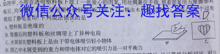 8.如图甲,小明在透明塑料板下放了一张爱心的图案,用丝绸裏住手指,照着图案用力摩擦塑料板后,均匀撒上木屑,竖起塑料板轻敲,板上留下了一颗由木屑组成的爱心,如图乙这个过程模拟了静电复印.下列说法错误的是A.塑料板是绝缘的B.摩擦后的塑料板和丝绸带上了异种电荷C.木屑留在塑料板上是由于带电体吸引轻小物体D.图乙中木屑受到的重力和带电体对它的吸引力是一对平衡力