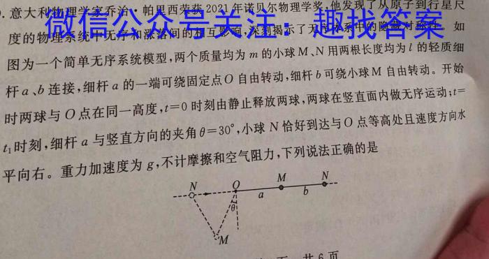 10.意大利物理学家乔治·帕里西荣获2021年诺贝尔物理学奖,他发现了从原子到行星尺度的物理系统中无序和涨落间的相互影响,深刻揭示了无序体系中的隐藏对称性。如图为一个简单无序系统模型,两个质量均为m的小球M、N用两根长度均为1的轻质细杆a、b连接,细杆a的一端可绕固定点O自由转动,细杆b可绕小球M自由转动。开始时两球与O点在同一高度,t=0时刻由静止释放两球,两球在竖直面内做无序运动;t=小球N恰好到达与O点等高处且速度方向水t1时刻,刻,细杆a与竖直方向的夹角=30^,擦和空气阻力,下列说法正确的是平向右。重力加速度为g,不计计摩MNNabM