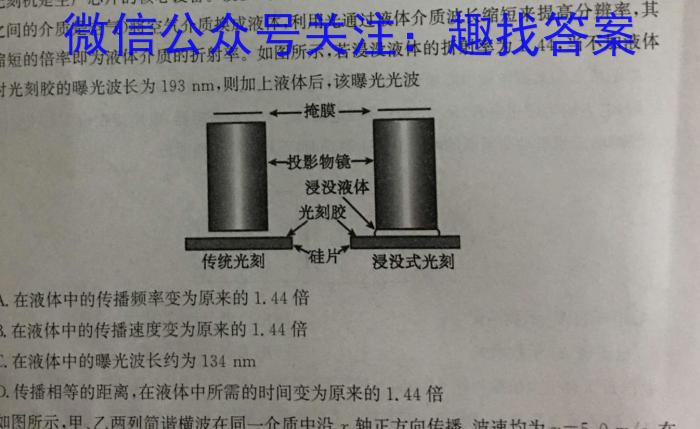 8.光刻机是生产芯片的核心设备。浸没式光刻技术是在传统的光刻技术中(其镜头与光刻胶之间的介质是空气)将空气介质换成液体,利用光通过液体介质波长缩短来提高分辨率,其缩短的倍率即为液体介质的折射率。如图所示,若浸没液体的折射率为1.44,当不加液体时光刻胶的曝光波长为193nm,则加上液体后,该曝光光波A.在液体中的传播频率变为原来的1.44倍B.在液体中的传播速度变为原来的1.44倍C.在液体中的曝光波长约为134nmD.传播相等的距离,在液体中所需的时间变为原来的1.44倍