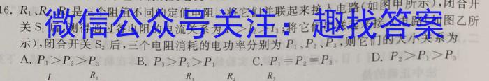 16.R、R、R是三个阻值不同的定值电阻。将它们并联起来接入电路(如图甲所示),闭合开16.R1、R2、R3关S后,测得通过各电阻的电流关系为I>I>I;将它们串联起来接人电路(如图乙所S1I1>I2>I3;示),闭合开关S后,三个电阻消耗的电功率分别为P、P、P;,则它们的大小关系为S2P1、P2、P3,D.P:>P>PD.P2>P1>P3A.P1>P2>P3B.P3>P2>P1C.P1=P2=P3