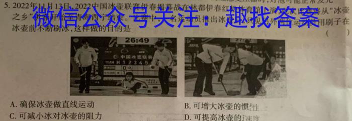 5.2022年11月13日,2022中国冰壶联赛伊春揭幕战在林都伊春红松体育馆上演此次比寒收从“冰壶之乡“伊春开始至青海西宁结束。比赛中,一名运动员推出冰壶后,只见另外两位运动品用刷子在冰壶前不断刷冰,这样做的目的是()A.确保冰壶做直线运动B.可增大冰壶的惯性C.可减小冰对冰壶的阻力D.可提高冰壶的速度