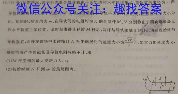 14.(13分)如图所示,两平行光滑金属导轨由圆轨道和水平轨道组成,圆轨道的半径为r,两导轨间距离为L,,水平轨道abed区域内有垂直于导轨平面的匀强磁场,磁感应强度大小为B.初始时,质量均为m、、在导轨间的电阻均为R的金属杆M、N分别静止于圆轨道最高点和水平轨道上某位置。某时刻由静止释放M杆后,两杆与导轨接触良好且运动过程始终与导轨垂直,两杆在磁场中未碰撞且N杆出磁场时的速度大小为gr3,已知重力加速度为g,感应电流产生的磁场及导轨电阻忽略不计,求:(1)M杆受到的最大安培力大小;(2)初始时刻N杆到ab的最短距离。MBaNbC