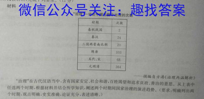 18.阅读材料,完成下列要求。(12分)材料“治理”一词在中国古籍中出现的次数摘编自方涛《治理内涵解析》“治理”在古代汉语当中,含有国家安定、社会和谐,百姓渴望和追求良政、善治的意思从表中任选两个时期,根据材料并结合所学知识,阐述两个时期间国家治理的演进趋势。(要求:明确列出两个时期,观点明确,史实准确,论证充分,表述清晰。)