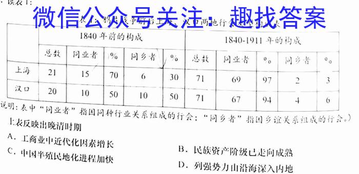 6.读表1:表1:鸦片战争前后上海、汉口两地行会类型构成表(说明:表中“同业者”指囚同种行业关系组成的行会;“同乡者”指因乡谊关系组成的行会。)上表反映出晚清时期A.工商业中近代化因素增长C.中国半殖民地化进程加快B.民族资产阶级已走向成熟
