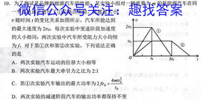 10.为了测试某品牌新能源汽车的性能,某实验小组对一辆质量为m的新能源汽车在同一平直轨道上进行了①②两次实验,其速度大小v随时间r的变化关系如图所示,汽车所能达到的最大速度为2v0,,每次实验中变速阶段加速度的大小相同;两次实验中汽车所受阻力大小均恒为fn对于第①次和第②次实验,下列说法正确的是A.两次实验汽车运动的位移大小相等B.两次实验汽车最大牵引力之比为2:1C.第①次实验汽车输出的最大功率为212fv0+4mv0^2l0D.两次实验的减速阶段汽车的输出功率都保持不变