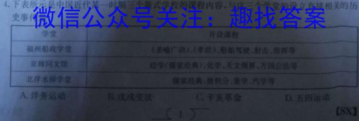4.下表所示是中国近代某一时期三个新式学校的课程内容,与这三个学堂的设立直接相关的历史事件是学堂开设课程福州船政学堂《圣喻广训)《孝经)船舶驾驶,射击,指挥等京师同文馆经学(儒家经典)、化学、天文测算、万国公法等北洋水师学堂偶家经典、微积分,重学、汽学等A.洋务运动B戊戌变法C.辛亥革命D.五四运动(12【SX】