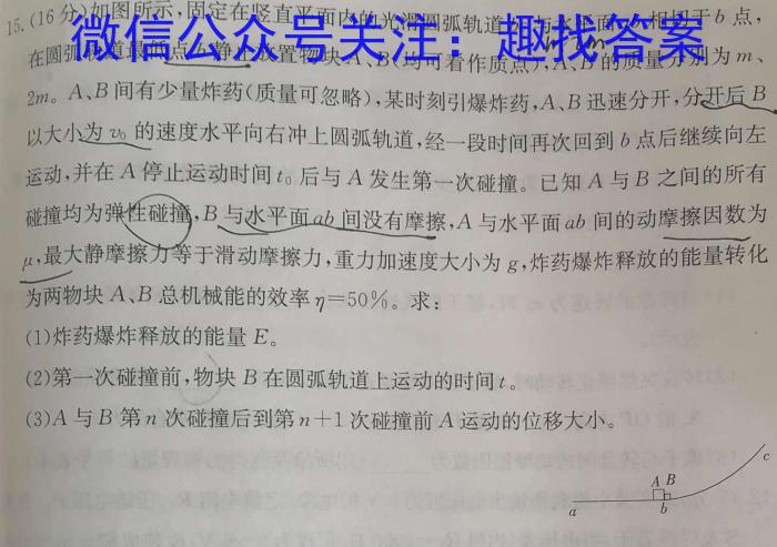 15.(16分)如图所示,固定在竖直平面内的光滑圆弧轨道bc与水平面ab相切于b点,与水平面mim,A、B的的质量分别为m、2m。A、B间有少量炸药(质量可忽略),某时刻引爆炸药,A、B迅速分开,分开后BBv0以大小为v的速度水平向右冲上圆弧轨道,经一段时间再次回到b点后继续向左t0运动,并在A停止运动时间t后与A发生第一次碰撞。已知A与B之间的所有静摩擦力等于滑动摩擦力,重力加速度大小为g,炸药爆炸释放的能量转化为两物块A、B总机械能的效率n=50%。,求:(2)第一次碰撞前,物块B在圆弧轨道上运动的时间t。(3)A与B第n次碰撞后到第n+1次碰撞前A运动的位移大小。CABab在圆弧轨道最低点b静止放置物块A、B(均可看作质点),碰撞均为弹性碰撞,B与水平面ab间没有摩擦,A与水平面ab间的动摩擦因数为(1)炸药爆炸释放的能量E。