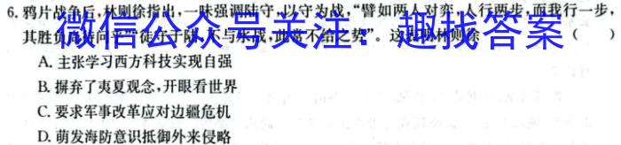 6.鸦片战争后,指出,一味强调陆守,以守为战,“譬如两人对弈,人行两步,而我行一步,其胜负尚待问乎”“徒守于陆,不与水战,此常不给之势”。这表明()A.主张学习西方科技实现自强B.摒弃了夷夏观念,开眼看世界C.要求军事改革应对边疆危机D.萌发海防意识抵御外来侵略