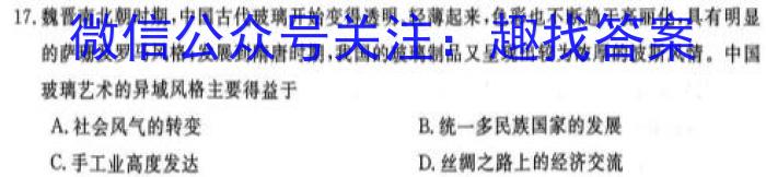 17.魏晋南北朝时期,中国古代玻璃开始变得透明、轻薄起来,色彩也不断趋于亮丽化,具有明显的萨珊及罗马风格;发展到隋唐时期,我国的玻璃制品又呈现出较为浓厚的波斯风情。中国玻璃艺术的异域风格主要得益于A.社会风气的转变B.统一多民族国家的发展C.手工业高度发达D.丝绸之路上的经济交流