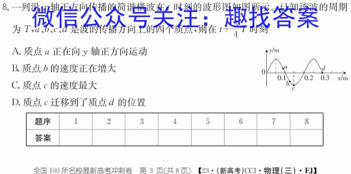 8.一列沿x轴正方向传播的简谐横波在t时刻的波形图如图所示。已知该波的周期为T,a,b,,d是波的传播方向上的四个质点,则在t+34T时刻A.质点a正在向y轴正方向运动B.质点b的速度正在增大C.质点c的速度最大D.质点c迁移到了质点d的位置全国100所名校最新高考冲刺卷第3页(共8页)【23·(新高考)CCJ⋅物理(三)·FJ】