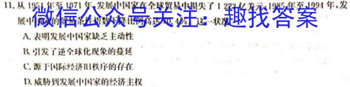11.从1951年至1971年,发展中国家在全球贸易中损失了1223亿美元:1985年至1994年,发展中国家的贸易条件指数下降比例高达70.4%。这一状况A.表明发展中国家缺乏主动性B.引发了逆全球化现象的蔓延C.源于国际经济秩序的存在D.威胁到发展中国家的经济主权