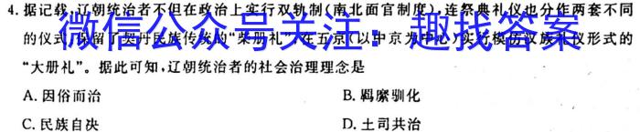 4.据记载,辽朝统治者不但在政治上实行双轨制(南北面官制度),连祭典礼仪也分作两套不同的仪式:保留了契丹民族传统的“柴册礼”;在五京(以中京为中心)实行模仿汉族礼仪形式的“大册礼”。据此可知,辽朝统治者的社会治理理念是A.因俗而治B.羁縻驯化C.D.土司共治