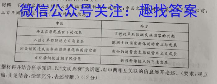 20.【文明兴衰】阅读材料,完成下列要求。(12分)材料下表内容摘编自许倬云先生编著的《许倬云说历史:中西文明的对照》第八章“现代以前:三百年间的差距”中关于中西对比的信息:依据材料并结合所学知识,以“文明兴衰”为话题,对中西相互关联的信息展开论述。(要求:观点明确,史论结合,论证充分,表述清晰。)(12分)