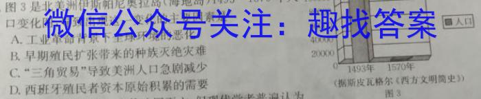 17.图3是北美洲伊斯帕尼奥拉岛(海地岛)1493∼1570年人口变化图,导致出现这一变化的主要因素是A.工业革命背景下全球环境的恶化B.早期殖民扩张带来的种族灭绝灾难C.“三角贸易”导致美洲人口急剧减少D.西班牙殖民者资本原始积累的需要