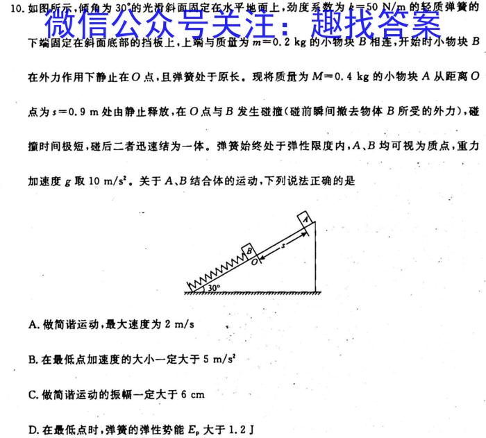 10.如图所示,倾角为30^°的光滑斜面固定在水平地面上,劲度系数为k=50N/m的轻质弹簧的下端固定在斜面底部的挡板上,上端与质量为m=0.2kg的小物块B相连,开始时小物块B在外力作用下静止在O点,且弹簧处于原长。现将质量为M=0.4kg的小物块A从距离O点为s=0.9m处由静止释放,在O点与B发生碰撞(碰前瞬间撤去物体B所受的外力),碰时间极短,碰后二者迅速结为一体。弹簧始终处于弹性限度内,A、B均可视为质点,重力加速度取10m/s^2。关于A、B结合体的运动,下列说法正确的是A.做简谐运动,最大速度为2m/sB.在最低点加速度的大小一定大于5m/s^2C.做简谐运动的振幅一定大于6cmD.在最低点时,弹簧的弹性势能Ep大于1.2J
