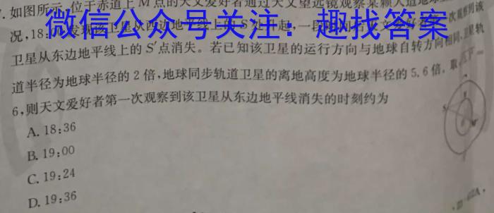 7.如图所示,位于赤道上M点的天文爱好者通过天文望远镜观察某颗人造地球卫星的情造地地况,18:00发现该卫星从西边地平线上的S处升起,一段时间后天文爱好者第一次该S'卫星从东边地平线上的S点消失。若已知该卫星的运行方向与地球自转方向理物道半径为地球半径的2倍,地球同步轨道卫星的离地高度为地球半径的5.6倍,取A6,则天文爱好者第一次观察到该卫星从东边地平线消失的时刻约为A.18:36B.19:00C.19:24D.19:36