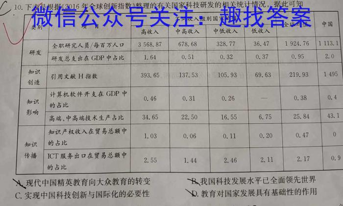 C10.下表是根据《2016年全球创新指数》整理的有关国家科技研发的相关统计情况。据此可知A现代中国精英教育向大众教育的转变B.我国科技发展水平已全面领先世界C.实现中国科技创新与国际化的必要性D.教育对国家发展具有基础性的作用