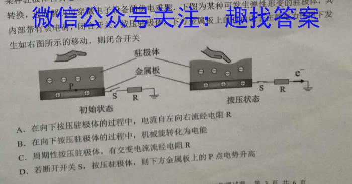 10.某种驻极体自身总带有定量的电荷,且所带电荷无法自由移动,利用驻极体可实现力电转换,进而解决可穿戴电子设备的供电难题.下图为某种可发生弹性形变的驻极体,其内部带有负电荷,闭合开关,按压驻极体,下方金属板上的自由电子在静电力作用下发生如右图所示的移动,则闭合开关A.在向下按压驻极体的过程中,电流自左向右流经电阻RB.在向下按压驻极体的过程中,机械能转化为电能C.周期性按压驻极体,有交变电流流经电阻RD.若断开开关Sn,按压驻极体,则下方金属板上的P点电势升高