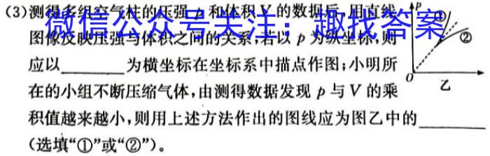 (3)测得多组空气柱的压强p和体积V的数据后,用直线图像反映压强与体积之间的关系,若以p为纵坐标,则应以为横坐标在坐标系中描点作图;小明所在的小组不断压缩气体,由测得数据发现p与V的乘积值越来越小,则用上述方法作出的图线应为图乙中的(选填“”或“②")