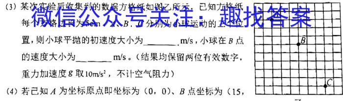 (3)某次实验后收集到的数据方格纸如图乙所示,已知方格纸每个方格边长为5cm,A、B.C分别为小球运动的三个位置,则小球平抛的初速度大小为m/s,小球在B点的速度大小为m/s。(结果均保留两位有效数字,重力加速度8取10m/s^2,,不计空气阻力)