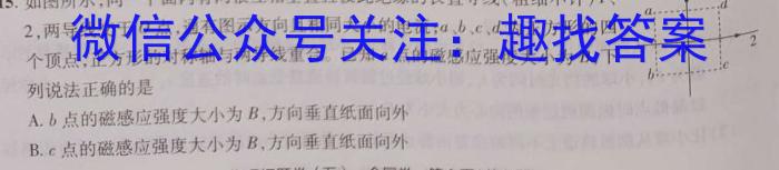 15.如图所示,同一平面内有两根互相垂直且彼此绝缘的长直导线(粗细不计)1、2,两导线交于O点,通有图示方向且相同大小的电流;;a、b、c、d为正方形的四个顶点,正方形的对称轴与两导线重合。已知a点的磁感应强度大小为B,下列说法正确的是2A.b点的磁感应强度大小为,方向垂直纸面向外B.c点的磁感应强度大小为B,,方向垂直纸面向外C.若撤去直导线1,d点的磁感应强度大小为D.若撤去直导线2,c点与a点的磁感应强度相同