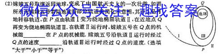 (2)嫦娥五号取壤返回地球,完成了中国航天史上的一次壮举.如图所示为嫦娥五号着陆地球前部分轨道的简化示意图,其中I是月地转移轨道,在P点由轨道I变为绕地椭圆轨道Ⅱ,在近地点Q再变为绕地椭圆轨道Ⅲ.在轨道Ⅱ运行时,嫦娥五号在Q点的机械能在P点的机械能.嫦娥五号沿轨道Ⅱ运行时经过Q点的速度沿轨道Ⅲ运行时经过Q点的速度.(选填“大于”“小于”“等于”)