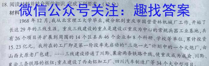18.阅读材料并结合所学知识,完成下列要求。(12分)材料1968年12月,我从北京理工大学毕业,被分配到重庆市国营晋林机械厂工作,开始了长达29年的三线生涯。重庆三线建设的重点是建设以重庆为中心的常规兵器工业基地共有26个项目并扩展到周围的14个区县共46个企业和8个科研、学校等单位累计投资15.23亿元。我所在的工厂即是第一阶段率先启动的“三炮一光”计划中的一个火炮厂,由山西太原老厂包建。……三线建设修通了川黔、襄渝两条铁路干线,使重庆成为成渝、川黔、襄渝三条铁路的枢纽;重点建设了西南铝加工厂、四川汽车制造厂等34个大中型项目。