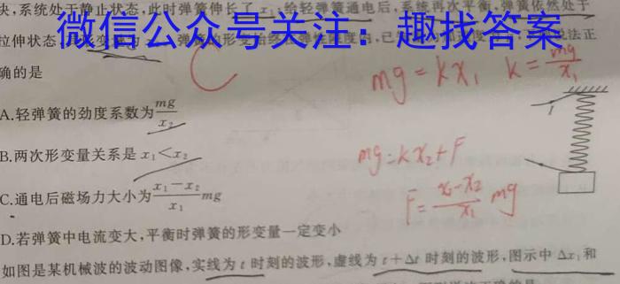 4.如图所示,由金属丝制作而成的轻弹簧上端焊接在天花板上,下端悬挂质量为,m的绝缘小物块,系统处于静止状态,此时弹簧伸长了给轻弹簧通电后,系统再次平衡,弹簧依然处于拉伸状态,其形变量为x2。,弹簧的形变始终在弹性限度内,已知重力加速度为g,下列说法正确的是mg=Kx,k=m&9A.轻弹簧的劲度系数为mgx2B.两次形变量关系是x1