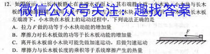 12.如图所示,一长木板静止在光滑水平面上,其右端静止放一小木块,小木块与长木板的接触面粗糙。现用一水平恒力,F向左拉动小木块,一段时间后,小木块从长木板左端滑下,小木块在木板上的运动过程中,下列说法正确的是A.拉力F做的功等于小木块动能的增加量B.摩擦力对长木板做的功等于长木板动能的增加量D.摩擦力与长木板长度的乘积等于系统摩擦产生的热量