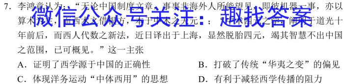 7.李鸿章认为:“无论中国制度文章,事事非海外人所能望见,即彼机器一事,亦以算术为主,而西术之借根方,本于中术之天元”;“中术四元之学,阐明于道光十年前后,而西人代数之新法,近日译出于上海,显然脱胎四元,竭其智慧不出中国之范围,已可概见。”这一主张A.证明了西学源于中国的正确性B.打破了传统“华夷之变”的偏见C.体现洋务运动“中体西用”的思想D.有利于减轻西学传播的阻力