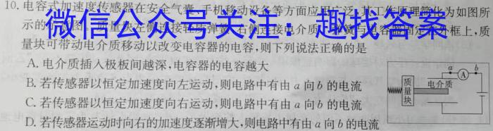 10.电容式加速度传感器在安全气囊、手机移动设备等方面应用广泛,其工作原理简化为如图所示的示意图。质量块左侧连接轻质弹簧,右侧连接电介质。弹簧与电容器固定在外框上,质量块可带动电介质移动以改变电容器的电容,则下列说法正确的是A.电介质插入极板间越深,电容器的电容越大B.若传感器以恒定加速度向左运动,则电路中有由a向b的电流C.若传感器以恒定加速度向右运动,则电路中有由a向b的电流D.若传感器运动时向右的加速度逐渐增大,则电路中有由a向b的电流