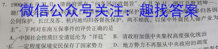 7.1900年6月21日,清政府颁布“向各国宣战懿旨”。6月26日,两江总督刘坤一、湖广总督张之洞等与列强驻上海领事商定《东南保护约款》,规定“上海租界归各国公同保护,长江及苏、杭内地均归各督抚保护,两不相扰,以保中外商民人命产业为主”。下列对东南互保事件的评价正确的是A./中国社会性质巨变清廷沦为“洋廷”B.清政府加强中央集权高度强化统治C.一定程度保境安民保存了国家势力D.地方势力不再服从中央政府的调度