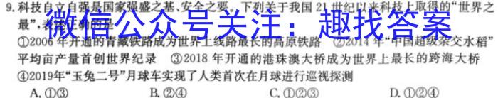 9.科技自立自强是国家强盛之基、安全之要。下列关于我国21世纪以来科技上取得的“世界之最”,表述正确的是①2006年开通的青藏铁路成为世界上线路最长的高原铁路②2014年“中国超级杂交水稻”平均亩产量首创世界纪录③2018年开通的港珠澳大桥成为世界上最长的跨海大桥④2019年“玉兔二号”月球车实现了人类首次在月球进行巡视探测A.①③B.②④C.①②③D.①②④