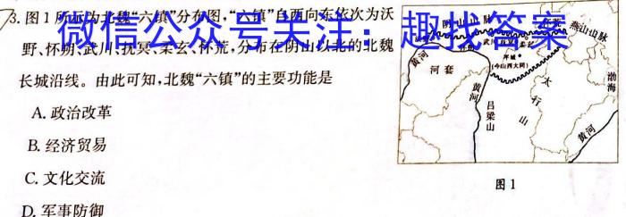 .图1所示为北魏“六镇”分布图,“六镇”自西向东依次为沃野、怀朔、武川、抚冥、柔玄、怀荒,分布在阴山以北的北魏长城沿线。由此可知,北魏“六镇”的主要功能是A.政治改革B.经济贸易C.文化交流D.军事防御A色,成为这些观念制度的载体,极大地扩展了一体化的关联纽带。这一现象说明科举制A.促进了儒家思想传播B.是维护等级秩序的工具C.巩固了中央集权统治D.推动了官僚政治的形成