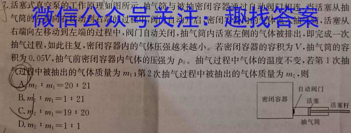 7.活塞式真空泵的工作原理如图所示,抽气筒与被抽密闭容器通过自动阀门相连,当活塞从抽气筒的左端向右移动到右端的过程中,阀门自动开启,密闭容器内的气体流人抽气筒,活塞从右端向左移动到左端的过程中,阀门自动关闭,抽气筒内活塞左侧的气体被排出,即完成一次抽气过程,如此往复,密闭容器内的气体压强越来越小。若密闭容器的容积为V,抽气筒的容积为0.05V,抽气前密闭容器内气体的压强为p0。,抽气过程中气体的温度不变,若第1次抽中被抽出的气体质量为m1;第2次抽气过程中被抽出的气体质量为m2,则A.m2:m1=20:21B.mB.mR:m1=1:21C.m2:m1=19:20D.m2:m1=1:1