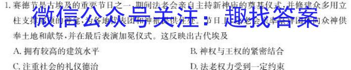1.赛德节是古埃及的重要节日之一,期间法老会亲自主持新神庙的奠基仪式,并修建众多用立柱支撑屋顶的神龛,为各地代表团和神提供住处。节日上,法老会亲率祭拜团体向众神供奉土地和献祭,并在最后表演加冕仪式。这反映出古代埃及A.拥有较高的建筑水平B.神权与王权的紧密结合C.注重社会的礼仪德治D.法老权力受到一定约束