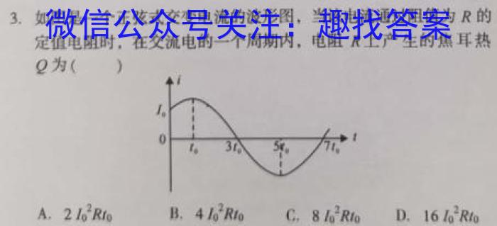 3.如图是一个正弦式交变电流的波形图,当该电流通过阻值为上产生的焦耳热R的定值电阻时,在交流电的一个周期内,电阻RQ为()A.2I0^2Rt0B.4I0^2Rt0C.8I0^2Rt0D.16I0^2Rt0