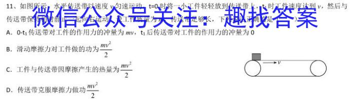 11、如图所示,水平传送带以速度ν匀速运动,t=0时将一小工件轻轻放到传送带上,t1时工件速度达到,然后与传送带保持相对静止一起向右运动。设工件质量为m,,传送带足够长,下列说法正确的是()A.0-t1传送带对工件的作用力的冲量为mv,t1后传送带对工件的作用力的冲量为0B.滑动摩擦力对工件做的功为c.工件与传达带因摩产生的热量为mv^22mv^22D.传送带克服摩擦力做功mv^22