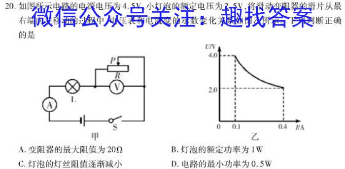 20.如图所示电路的电源电压为4.5V,,小灯泡的额定电压为2.5V,,将滑动变阻器的滑片从最右端向左移动的过程中,电压表和电流变的示数变化关系如图乙所示。下列判断正确的是A.变阻器的最大阻值为20ΩB.灯泡的额定功率为1WC.灯泡的灯丝阻值逐渐减小D.电路的最小功率为0.5W