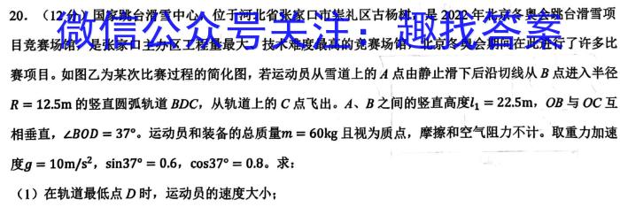 20.(12分)国家跳台滑雪中心,位于河北省张家口市崇礼区古杨树,是2022年北京冬奥会跳台滑雪项目竞赛场馆,是张家口主办区工程量最大、技术难度最高的竞赛场馆,北京冬奥会期间在此进行了许多比赛项目。如图乙为某次比赛过程的简化图,若运动员从雪道上的A点由静止滑下后沿切线从B点进入半径R=12.5m的竖直圆弧轨道BDC,从轨道上的C点飞出。A、B之间的竖直高度l1=22.5m,OB与OC互相垂直,BOD=37^。,运动员和装备的总质量m=60kg且视为质点,摩擦和空气阻力不计。取重力加速度g=10m/s^2,37^=0.6,37^=0.8。求:(1)在轨道最低点D时,运动员的速度大小;