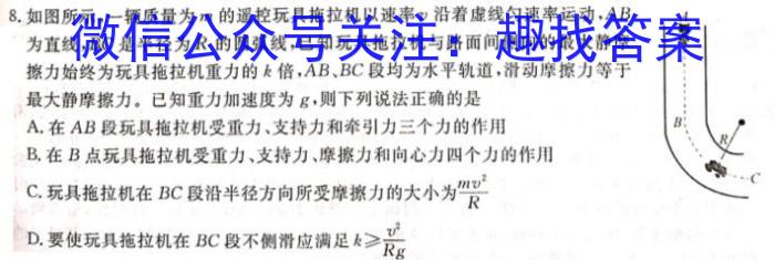 8.如图所示,一辆质量为m的遥控玩具拖拉机以速率v沿着虚线匀速率运动,AB为直线,BC是半径为R的圆弧线,已知玩具拖拉机与路面间侧向的最大静摩擦力始终为玩具拖拉机重力的k倍,AB、BC段均为水平轨道,滑动摩擦力等于最大静摩擦力。已知重力加速度为g,则下列说法正确的是A.在AB段玩具拖拉机受重力、支持力和牵引力三个力的作用B.在B点玩具拖拉机受重力、支持力、摩擦力和向心力四个力的作用C.玩具拖拉机在BC段沿半径方向所受摩擦力的大小为mv^2RD.要使玩具拖拉机在BC段不侧滑应满足,kv^2Rg
