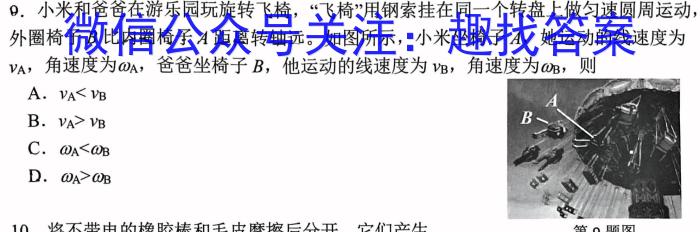 9.小米和爸爸在游乐园玩旋转飞椅,“飞椅”用钢索挂在同一个转盘上做匀速圆周运动,外圈椅子B比内圈椅子A距离转轴远。如图所示,小米坐椅子A,她运动的线速度为vA,,角速度为A,爸爸坐椅子B,他运动的线速度为vB,角速度为B,,则A.vA