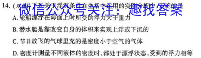 14.(双选)下列关于浮沉条件在生活中运用的实例分析中,正确的是A.轮船漂浮在海面上时所受的浮力大于重力B.潜水艇是靠改变自身的体积来实现上浮或下沉的C.节日放飞的气球里充的是密度小于空气的气体D.密度计测量不同液体的密度时,都处于漂浮状态,受到的浮力相等