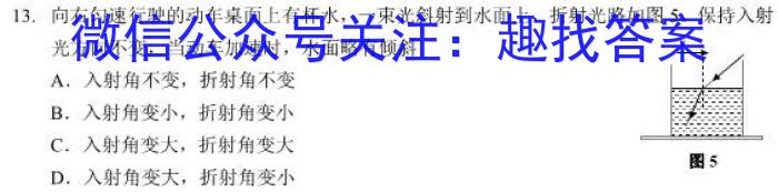 13.向右匀速行驶的动车桌面上有杯水,一束光斜射到水面上,折射光路如图5。保持入射光方向不变,当动车加速时,水面略有倾斜A.入射角不变,折射角不变B.入射角变小,折射角变小C.入射角变大,折射角变大D.入射角变大,折射角变小