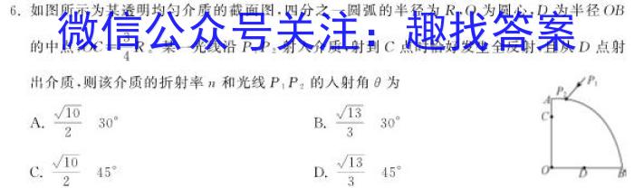 6.如图所示为某透明均匀介质的截面图,四分之一圆弧的半径为R,O为圆心,D为半径OB的中点,OC=34R.某一光线沿P1P2射入介质,射到C点时恰好发生全反射,且从D点射出介质,则该介质的折射率n和光线P1P2的人射角0为A.10230^B.13330C.10245^D.13345^